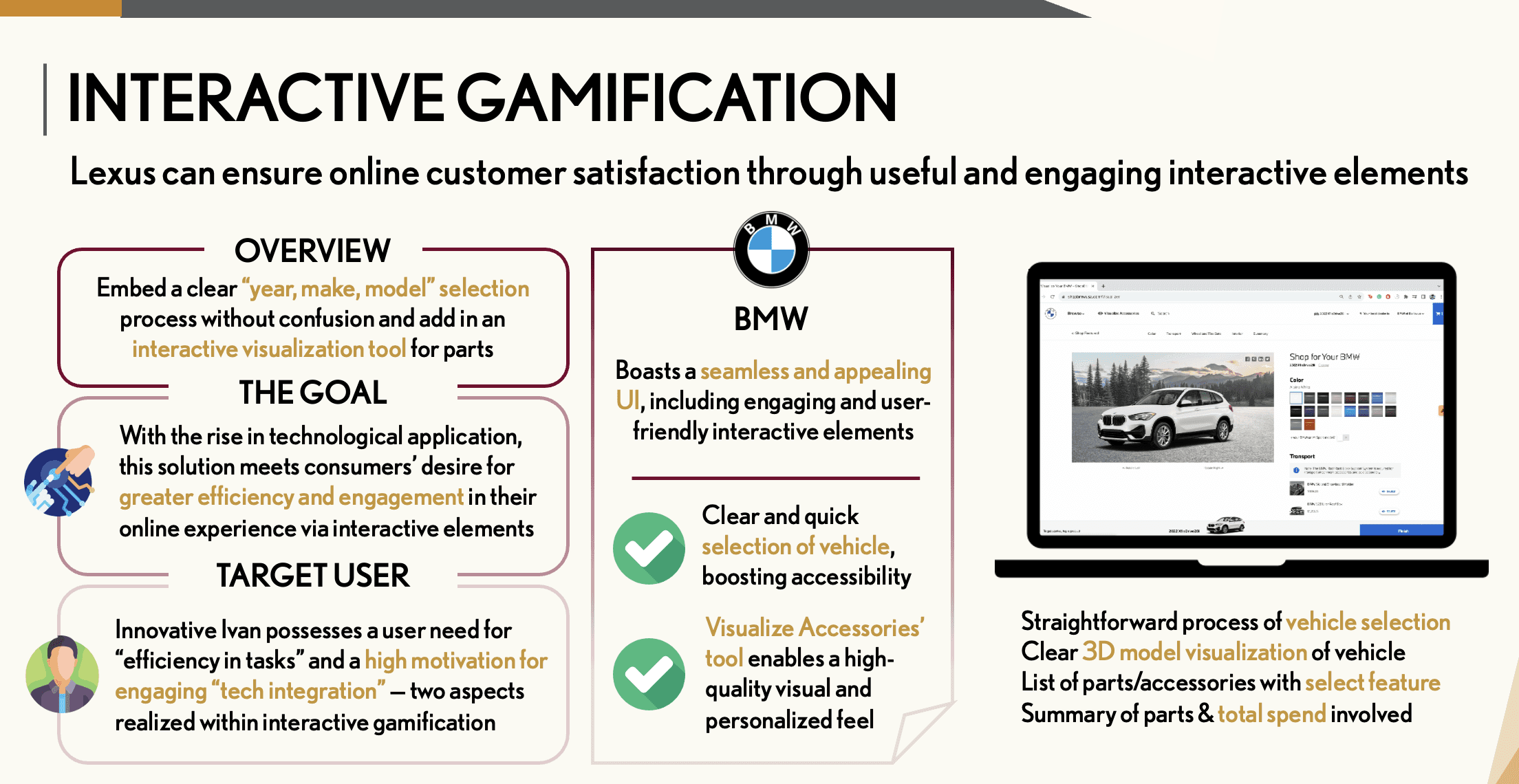 I also designed eight marketing strategies and four consumer journey maps to align offerings with dealer and customer needs. Delivering six final recommendations with full rollout strategy, AI integrations, and KPI-based performance frameworks, I helped position Lexus to scale its B2B and B2C e-commerce impact across North America.