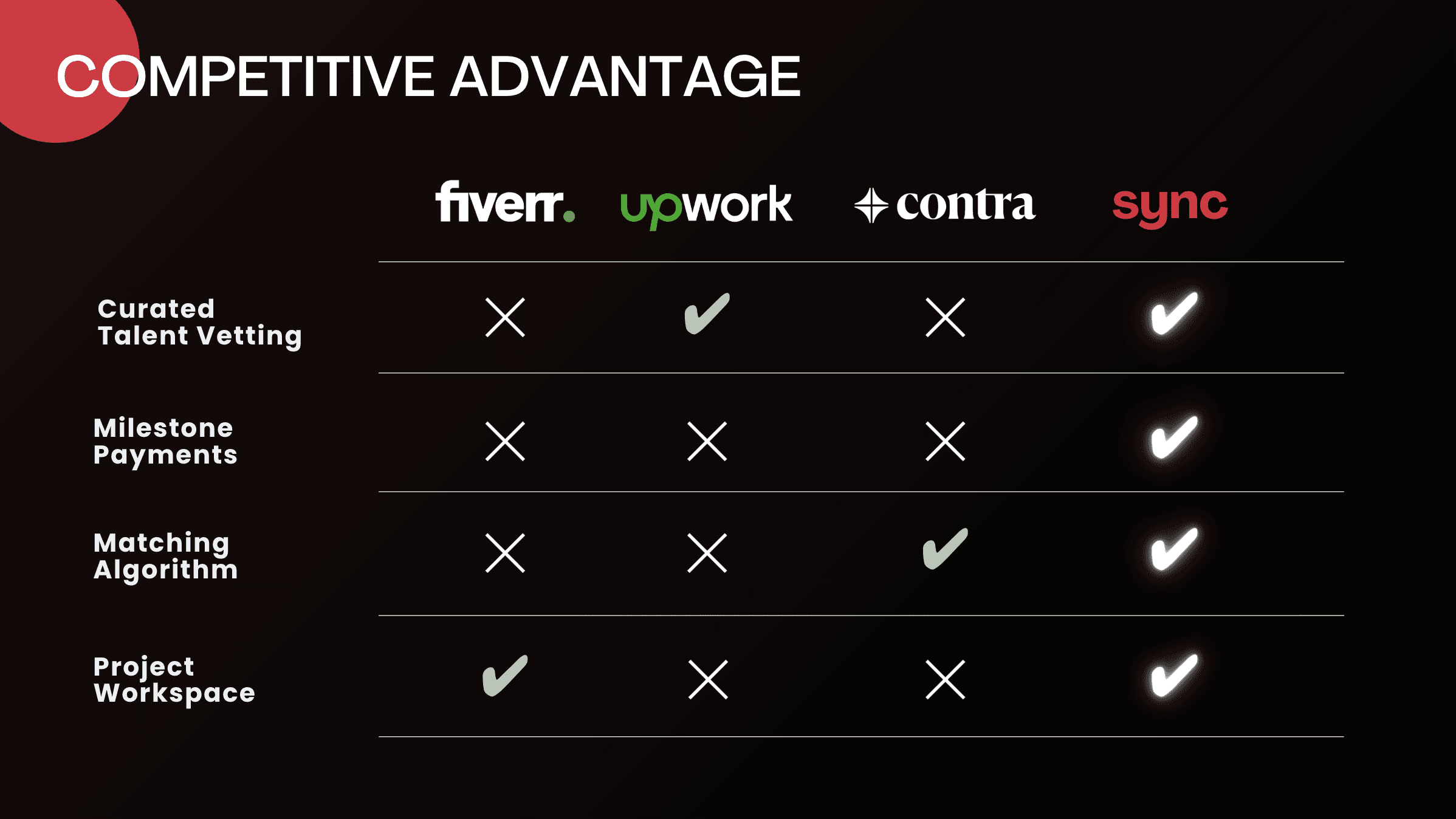 Alongside the product, we curated a full pre-seed deck positioning Sync for investor readiness. The goal of Sync was to build what I believe is an ideal pre-seed startup: one that hits every pillar of my investment ideology, demonstrates the build of an AI-personalized product, and proves itself through meaningful traction if we pursue the venture.